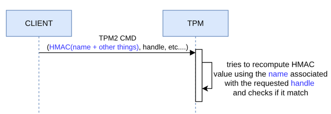 To do so, the command or response includes an HMAC (i.e. signature) that represents the object in transit. In the case of a command involving one or more keys, the name is an element of the signature. When the TPM receives the command, it loads the keys from the specified handles and computes the name to reproduce the HMAC. If the HMAC is verified, we have assurance of the authenticity of the name/handle pair binding and that we are not victims of a substitution attack.
